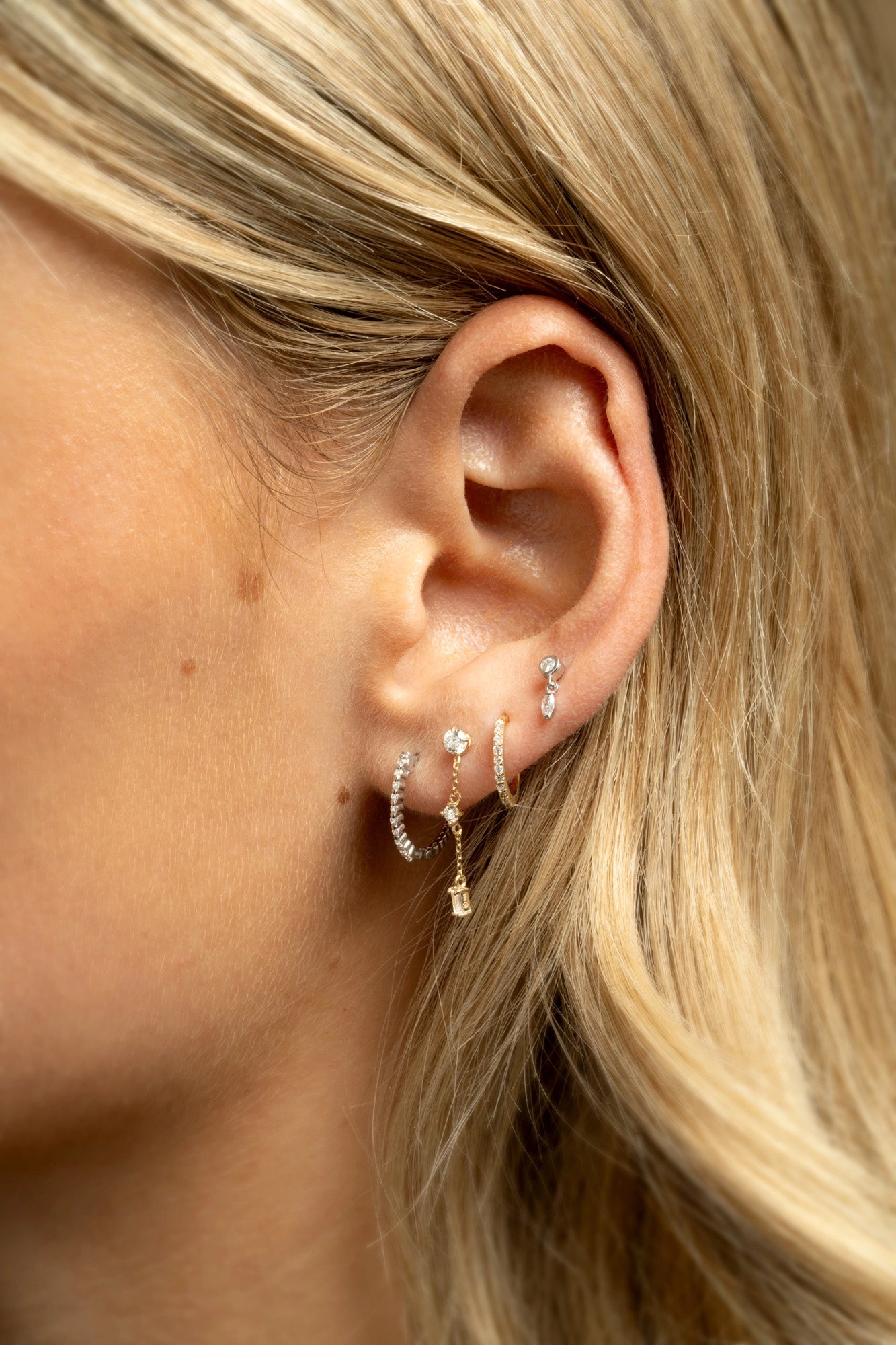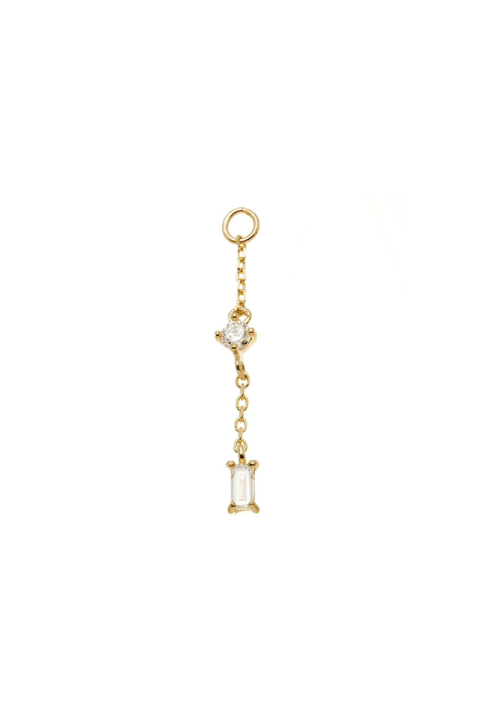 Add a little sparkle and movement to your stack. This solid gold chain earring charm features a brilliant-cut and baguette-cut diamond adding sparkle from every angle. Perfect for attaching to studs or rings for a little extra character.