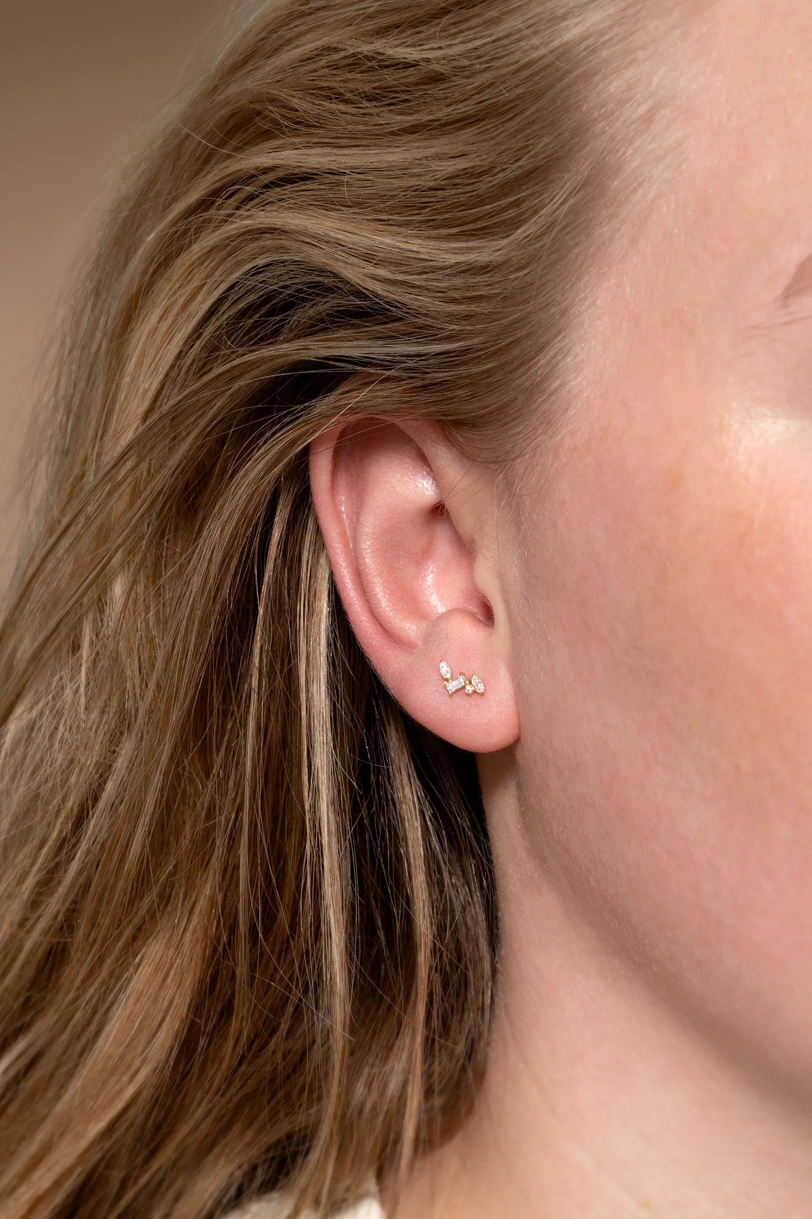 Quirky and sparkly! These solid gold stud earrings feature an eye-catching cluster of baguette, marquise, and round-cut diamonds in a softly arched formation. These studs can easily be worn as a standout solo piece, or as part of a curated stack.