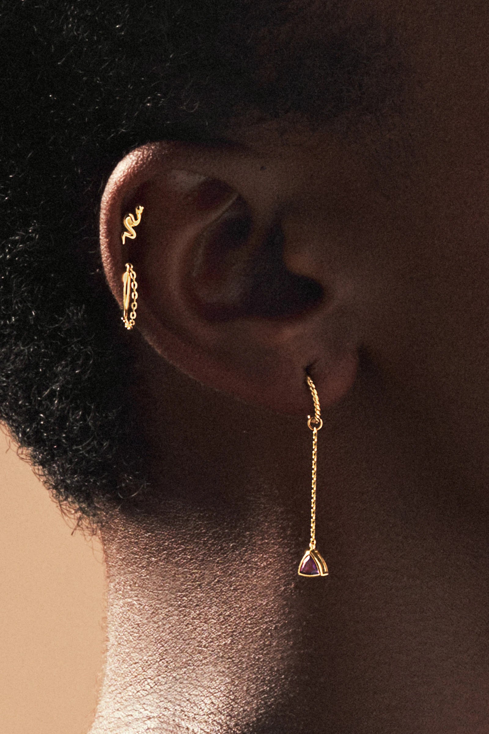 Add a touch of colour and soft movement to your stack with this 14ct solid gold earring charm. A natural amethyst trillion-cut gem sits at the end of a polished chain – subtle, playful and perfect for styling with hoops or studs.