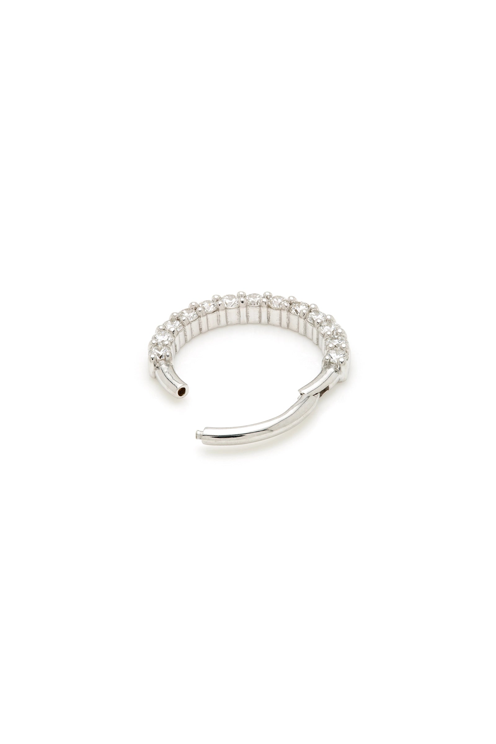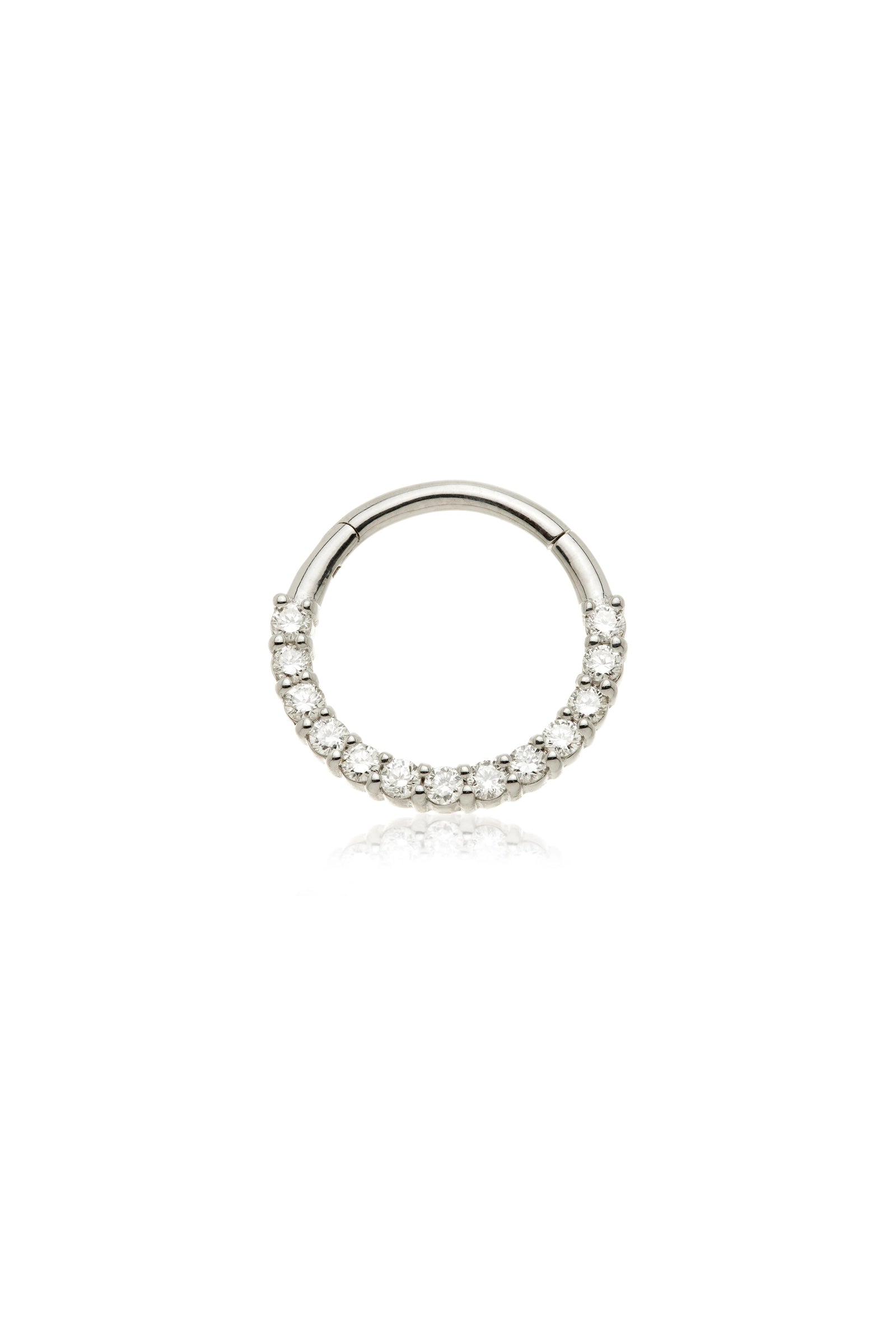 A solid gold front facing daith/septum ring, set with a row of dazzling princess-cut pavé diamonds along the front. Bold and eye-catching in daith or septum placements.