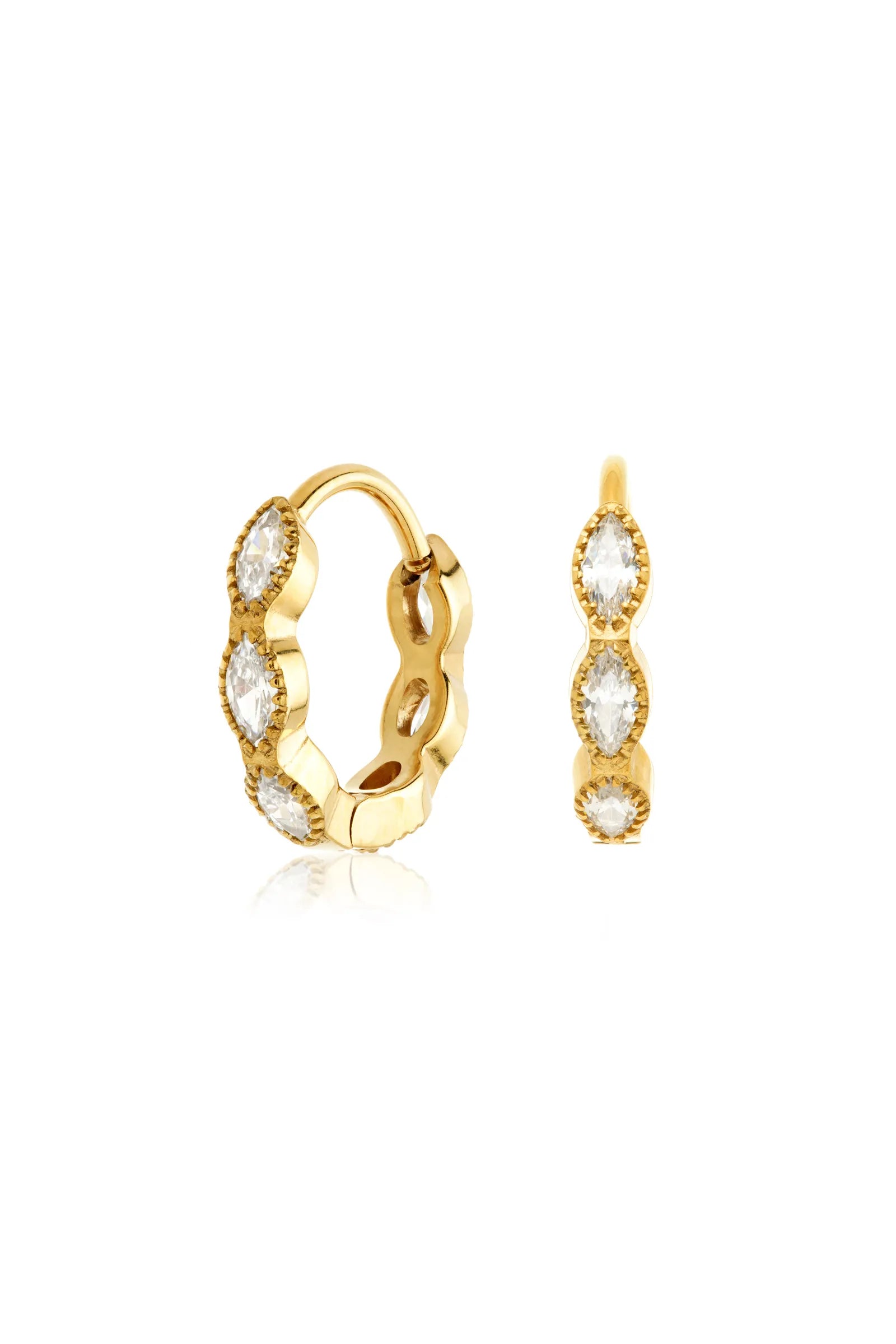 Designed with comfort in mind, these lightweight gold-finished titanium hoop earrings feature marquise-cut stones for a touch of sparkle. A subtle statement piece that pairs well with any stack or can be worn solo.