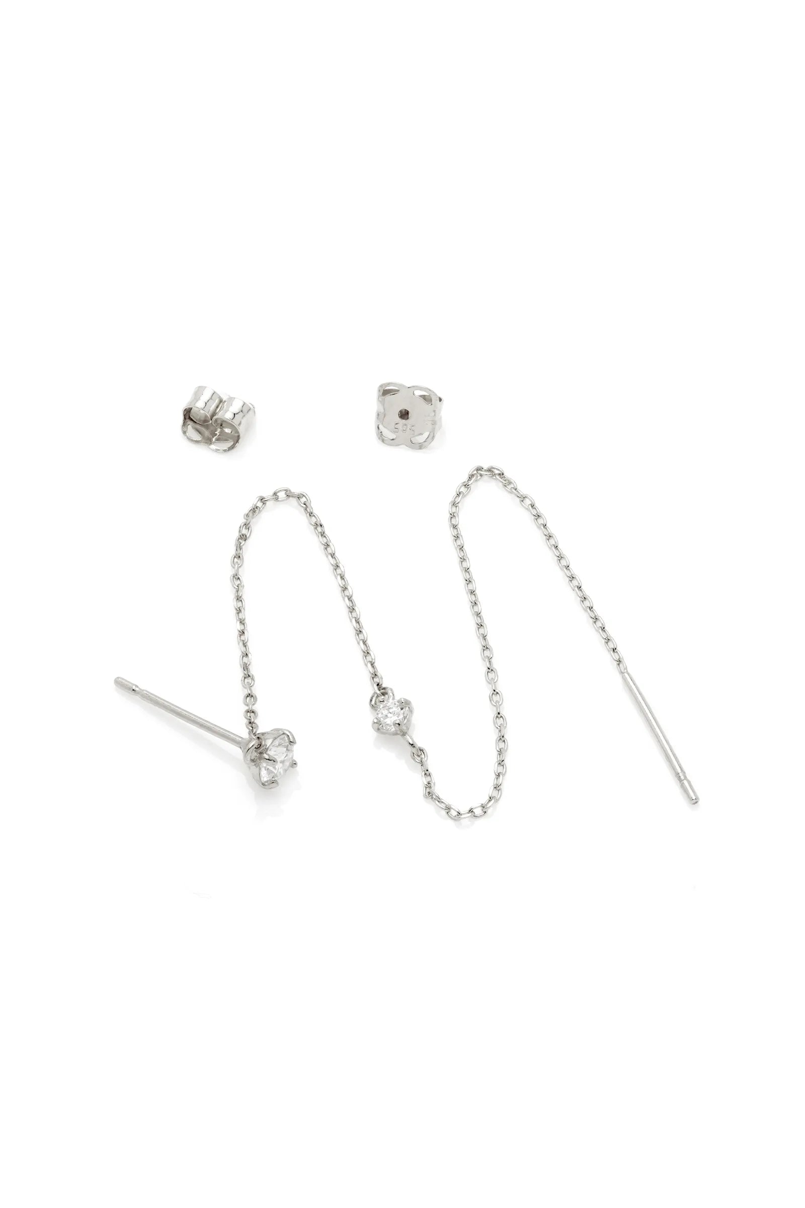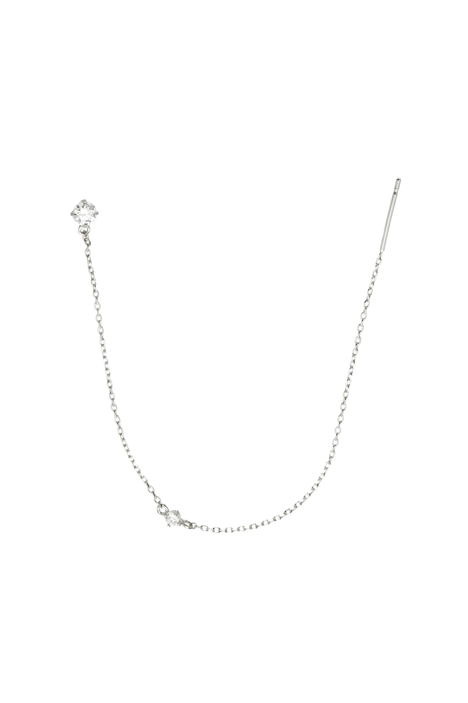 Add detail and sparkle to your ear stack with this solid white gold stud earring, featuring two beautiful diamonds and a solid white gold chain. An elegant way to bring movement and shine to your look.