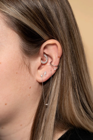 Solid 14ct Gold Diamond Stud Earring with Hanging Chain - White Gold