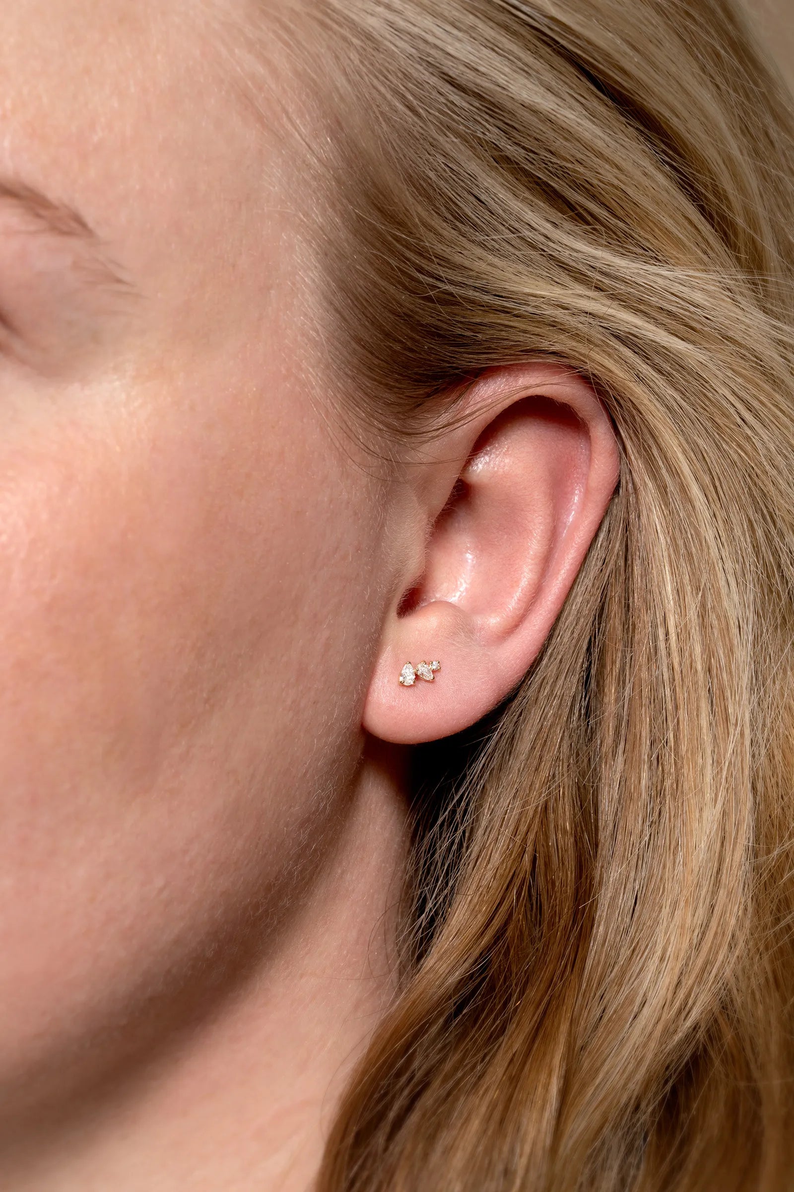 A delicate yet dazzling addition to your ear stack. These solid gold cluster studs feature pear-cut diamonds and a brilliant-cut diamond arranged in an elegant arc – can be worn solo to add some sparkle, or stacked with other pieces for a unique look.