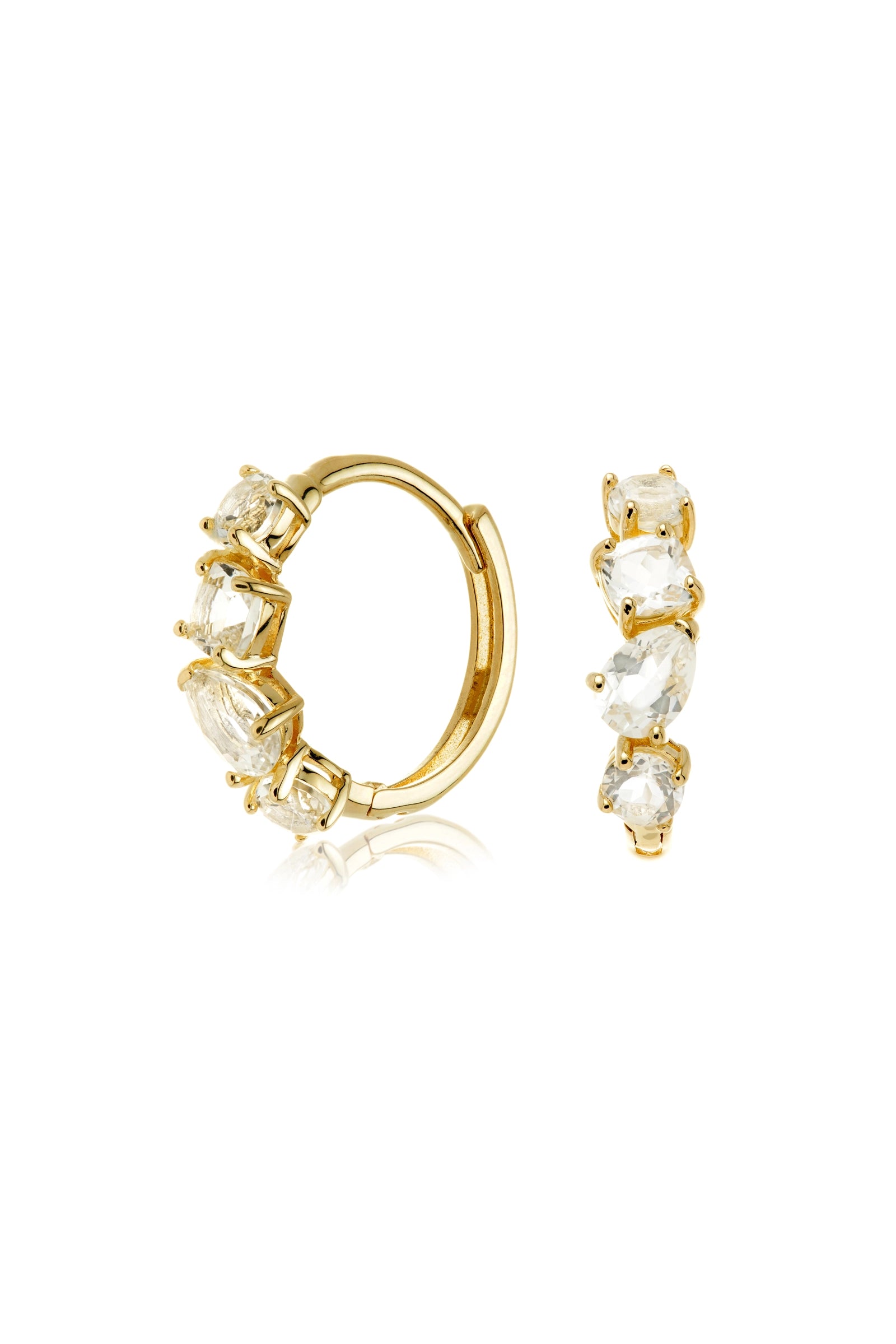 Quirky style with a touch of shimmer. These solid gold hoop earrings feature a single row of multi-shaped white topaz gemstones for a twinkling finish that catches the light. Perfect for everyday wear or stacking with your favourite styles.