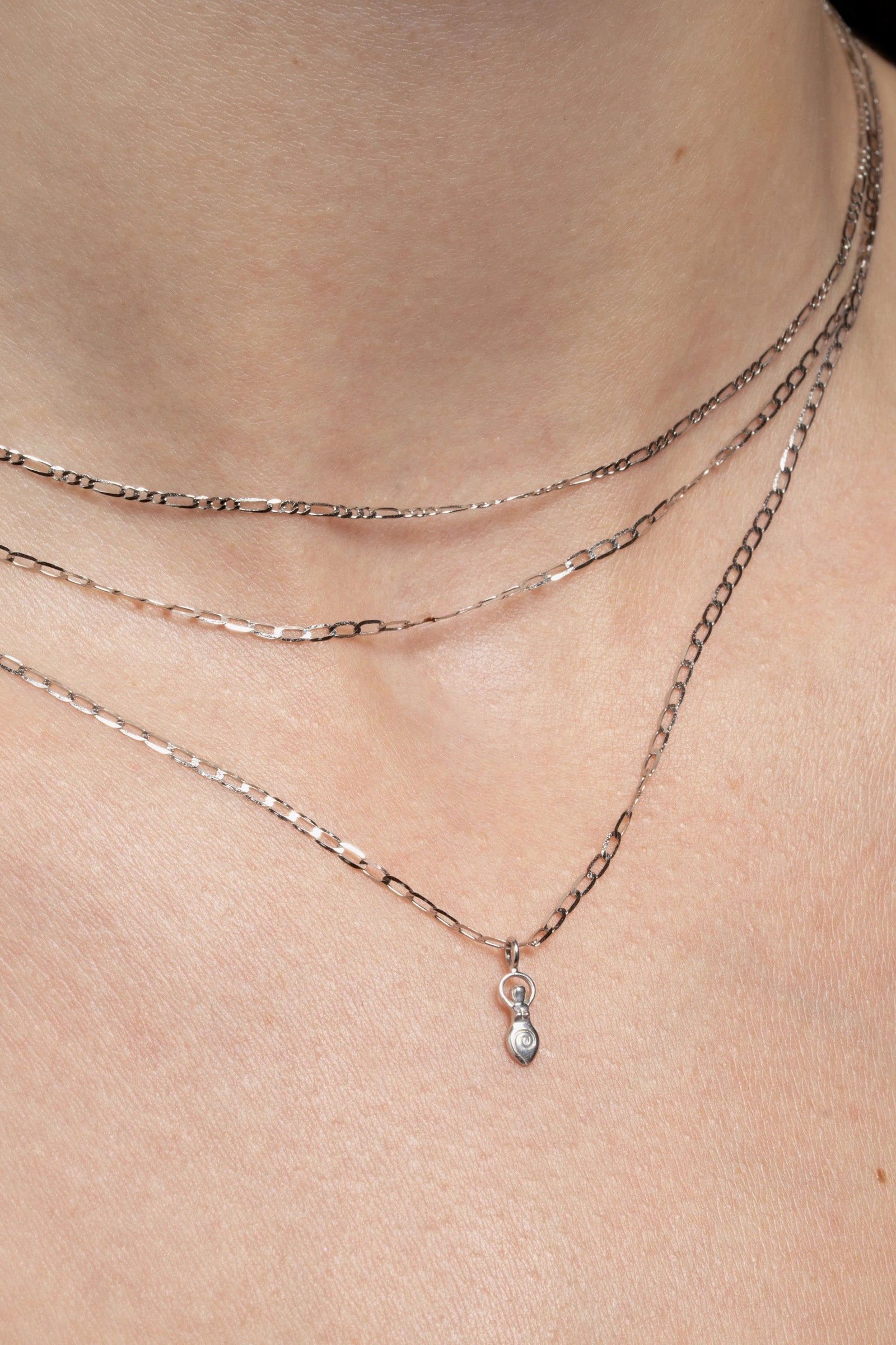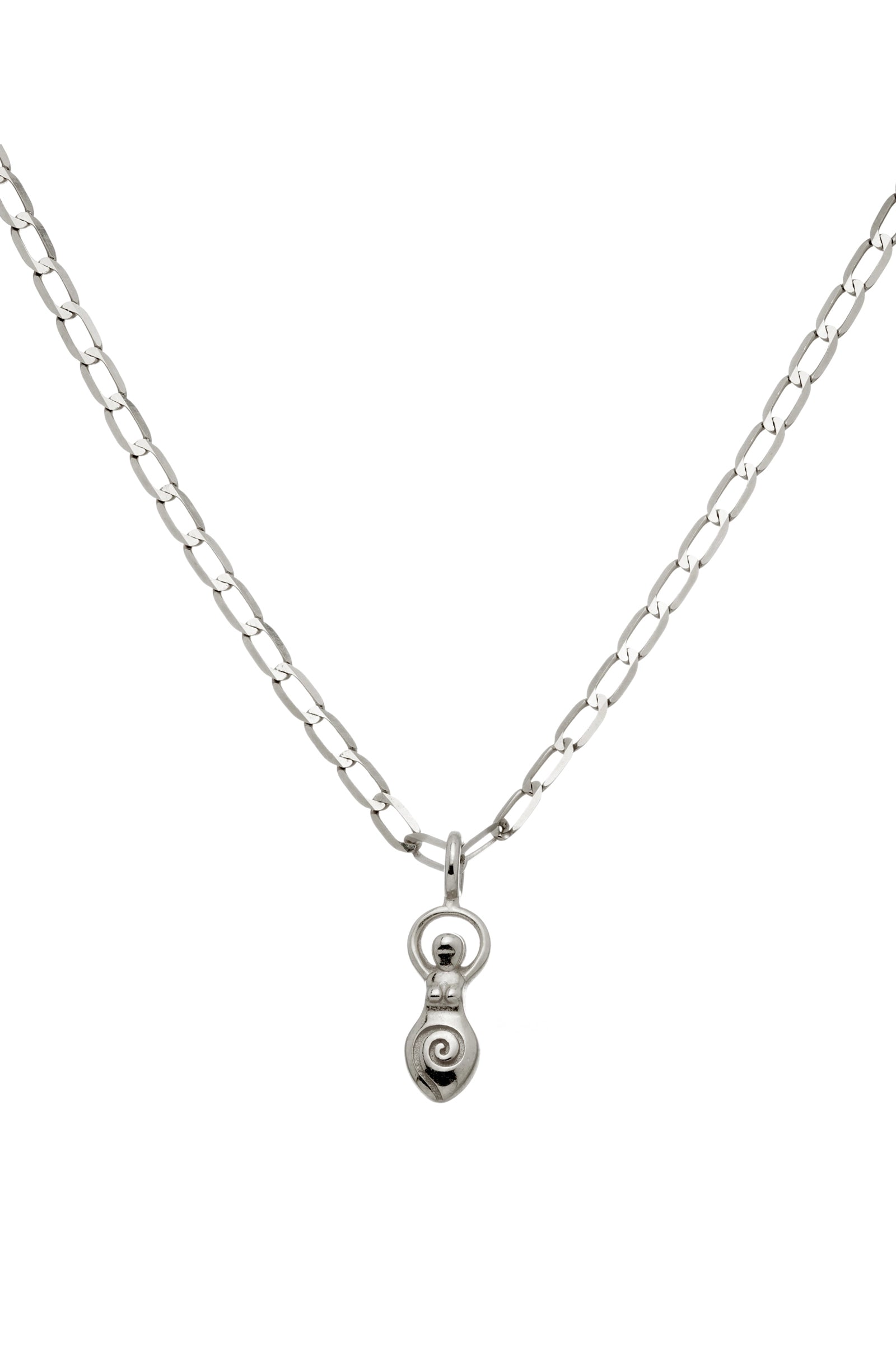A symbol of life, rebirth, feminine energy and strength. This solid white gold necklace features a goddess-inspired pendant with soft curves and engraved spiral detailing – made to channel your inner goddess and to be worn close to the heart.