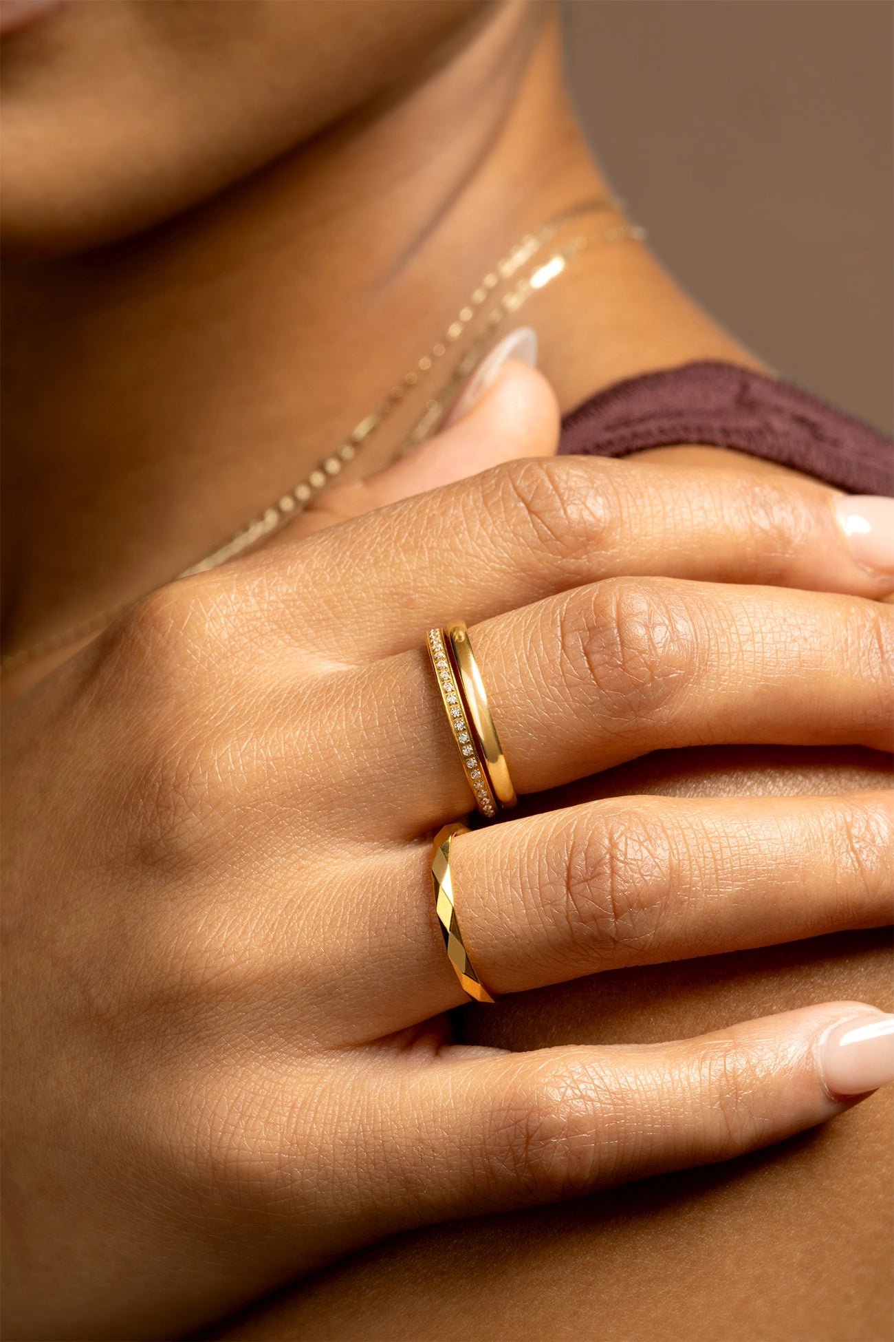 This faceted stacking ring catches the light and shimmers from every angle, adding texture and shine to any stack. The sculpted surface gives it a bold edge while staying easy to wear.