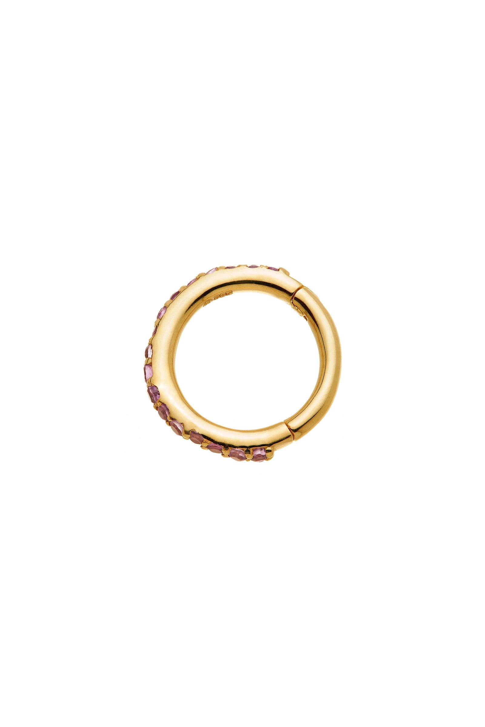 Add a little natural colour to your stack with this solid gold eternity hinged ring, set with a full row of rich purple pavé-set amethyst stones. A playful twist on a classic style, perfect for adding some character to your daily look or for matching up with specific outfits.