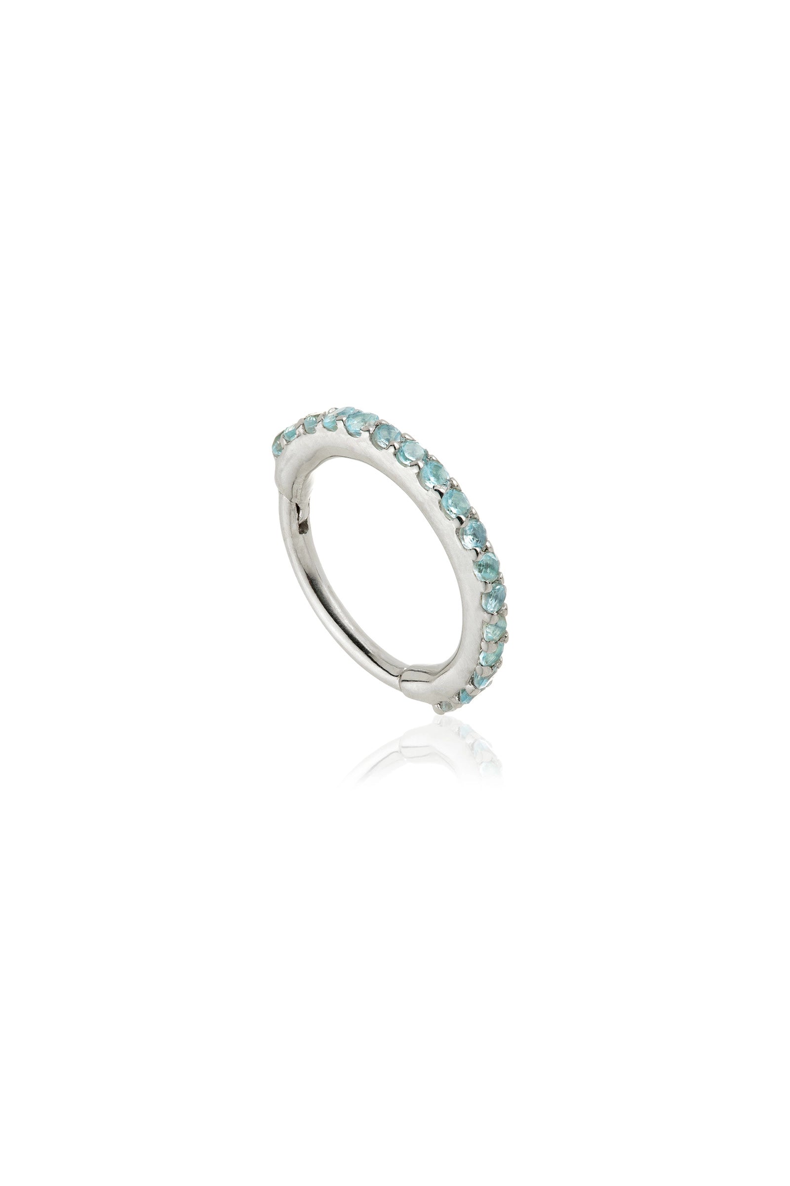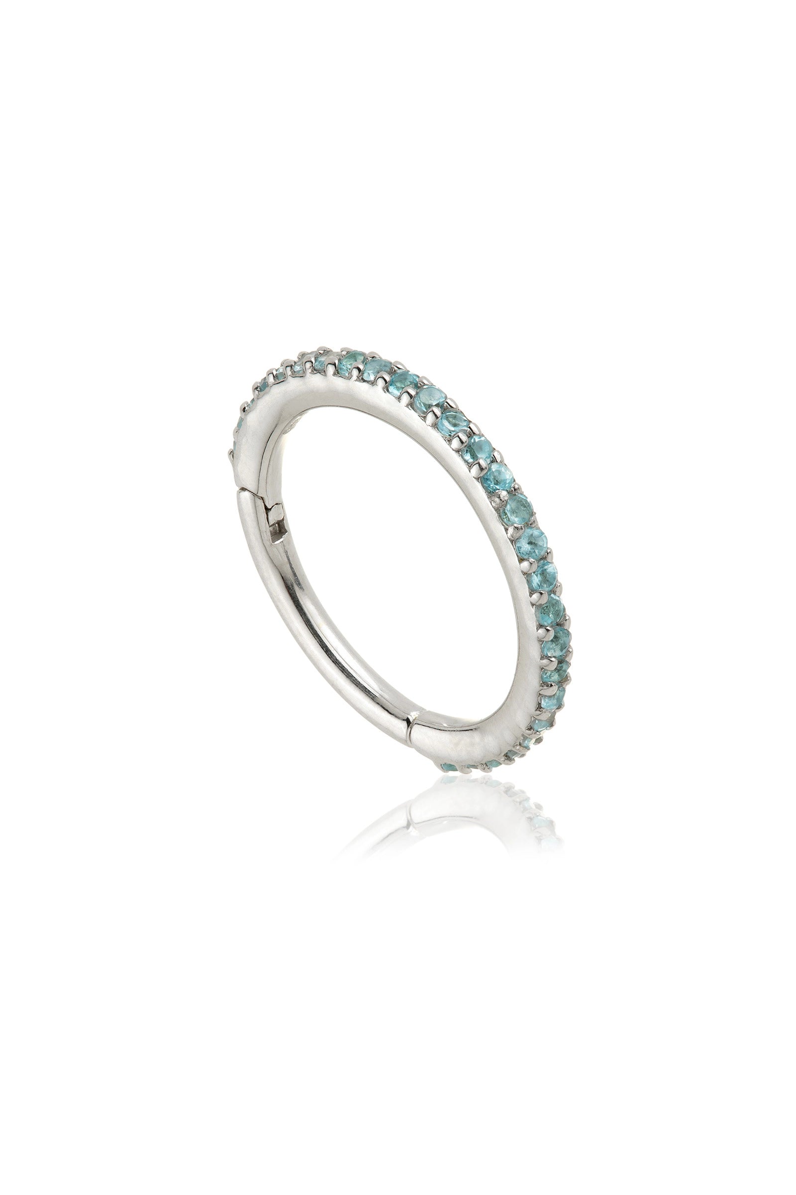 Add a little natural colour to your stack with this solid gold eternity hinged ring, set with a full row of light blue pavé-set Swiss blue topaz stones. A playful twist on a classic style, perfect for adding some character to your daily look or for matching up with specific outfits.
