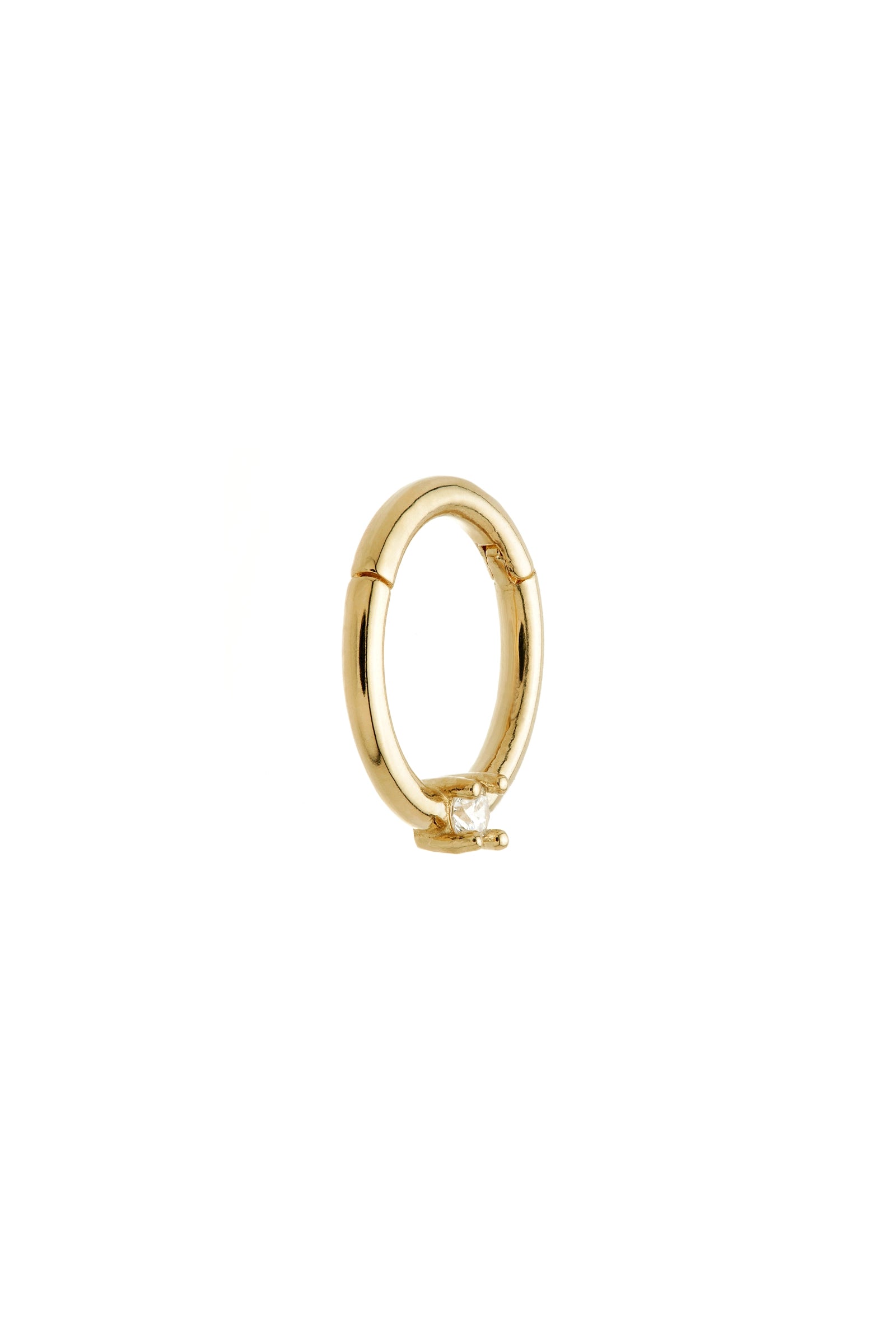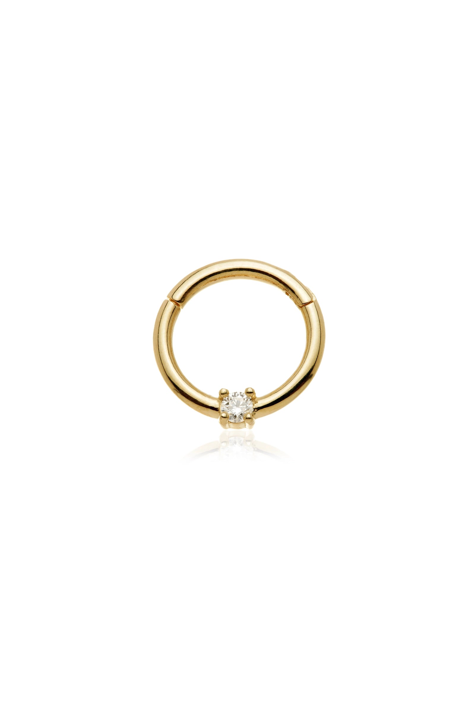 Simple, stunning and sparkly! This solid gold daith/septum ring is set with a single 2mm diamond in a classic prong setting. This hinged septum/daith ring brings a refined finish to any look.