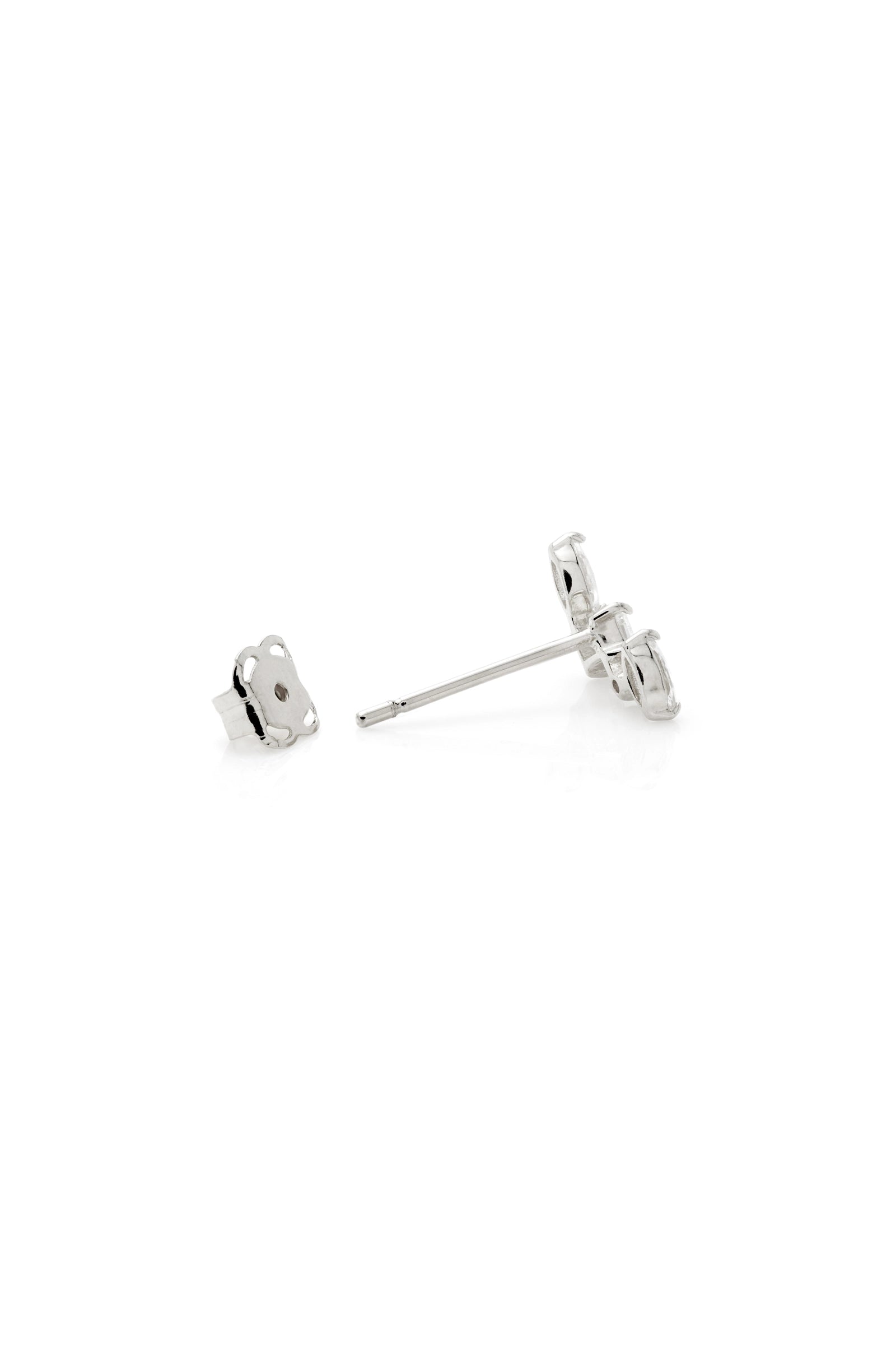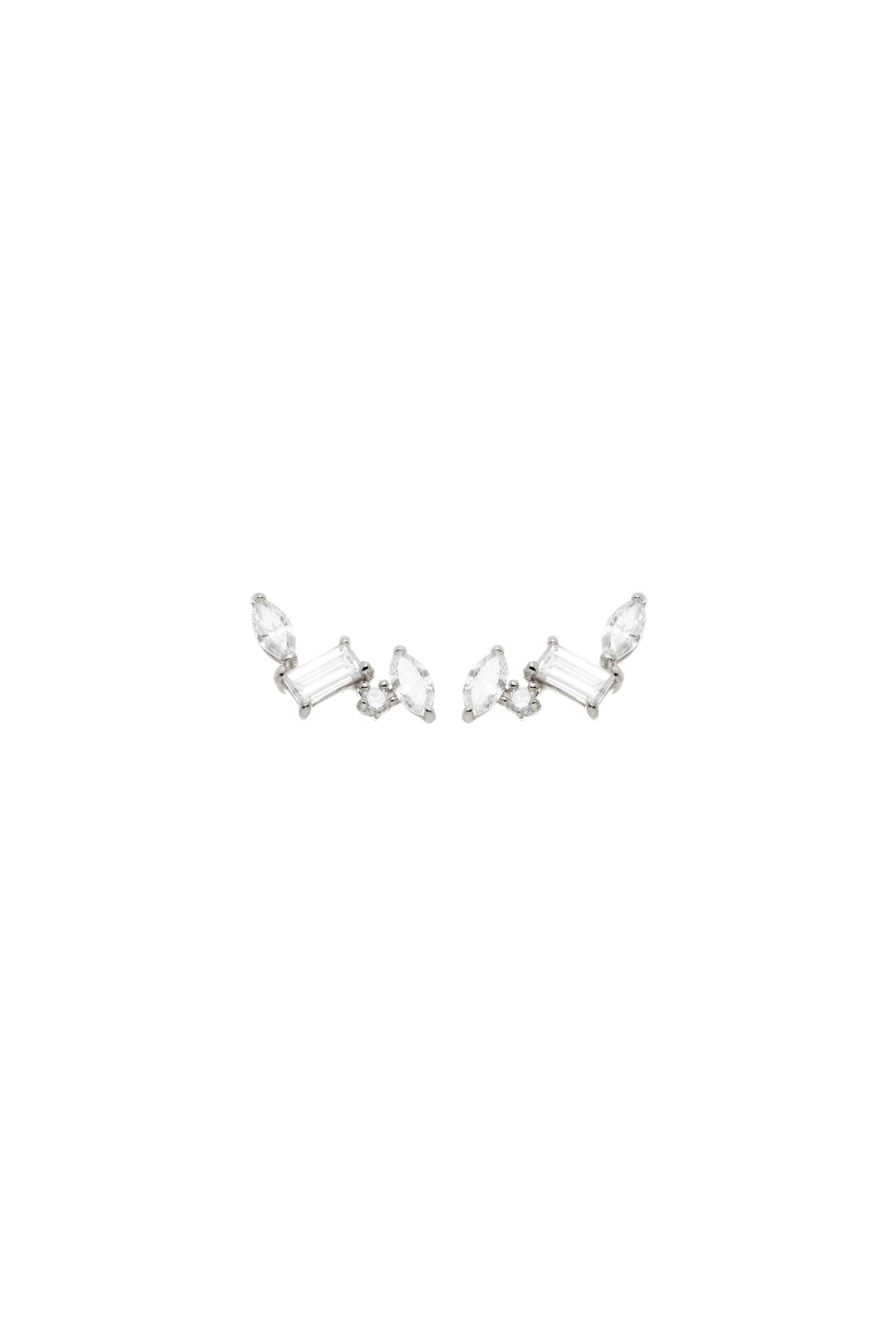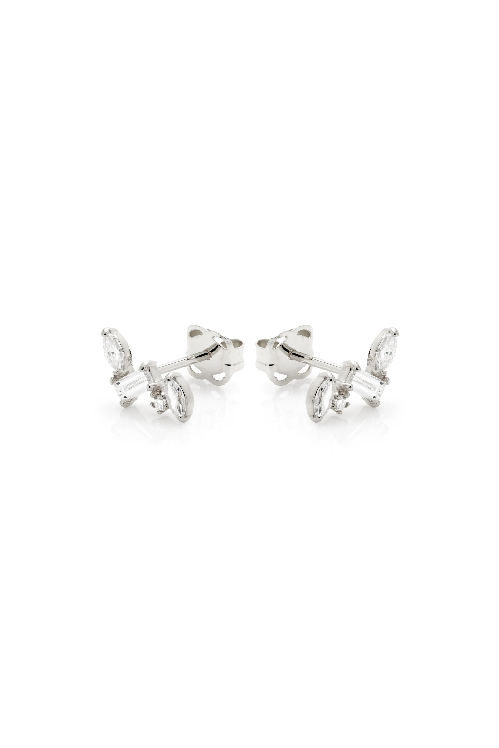 Quirky and sparkly! These solid white gold stud earrings feature an eye-catching cluster of baguette, marquise, and round-cut diamonds in a softly arched formation. These studs can easily be worn as a standout solo piece, or as part of a curated stack.