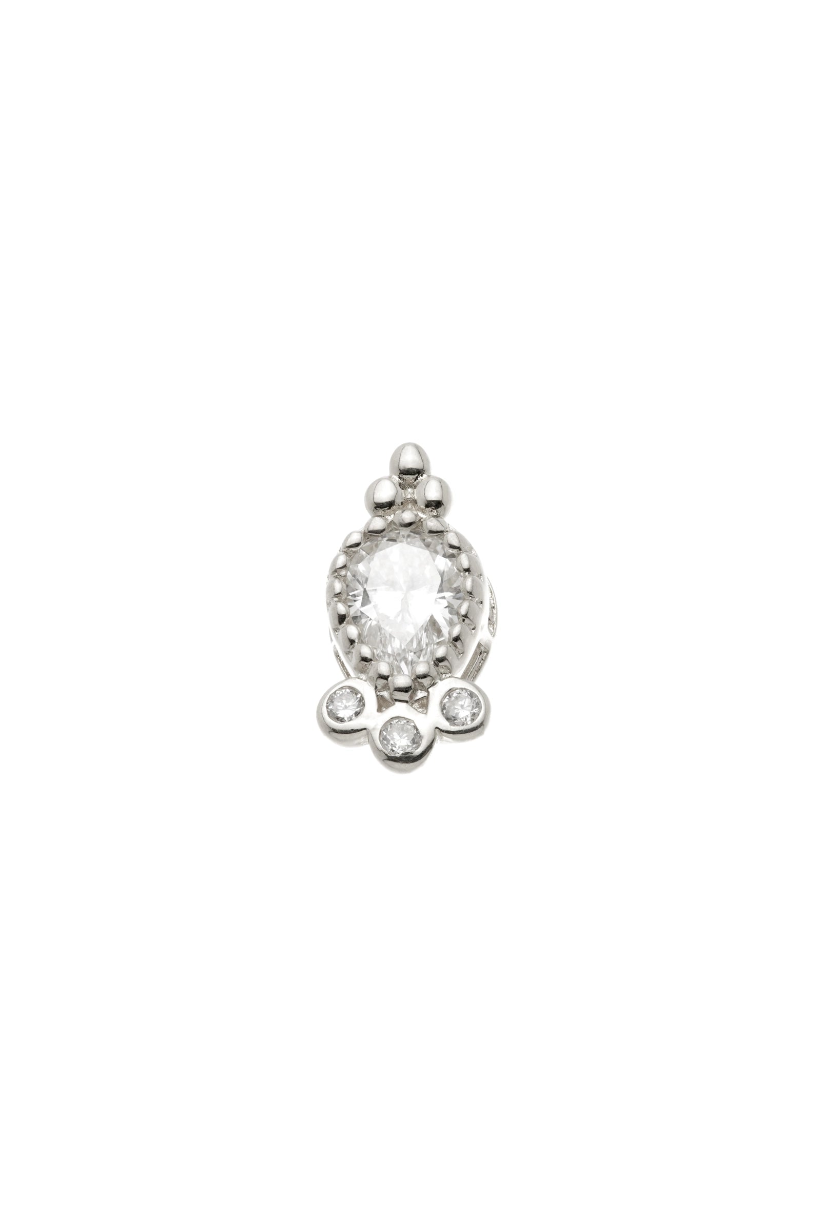 Ornate and eye-catching, this solid white gold diamond stud earring features a dazzling central teardrop diamond framed by a gem cluster and detailed milgrain and tri-ball gold motif. Perfect for special occasions or for creating a focal point in your stack.