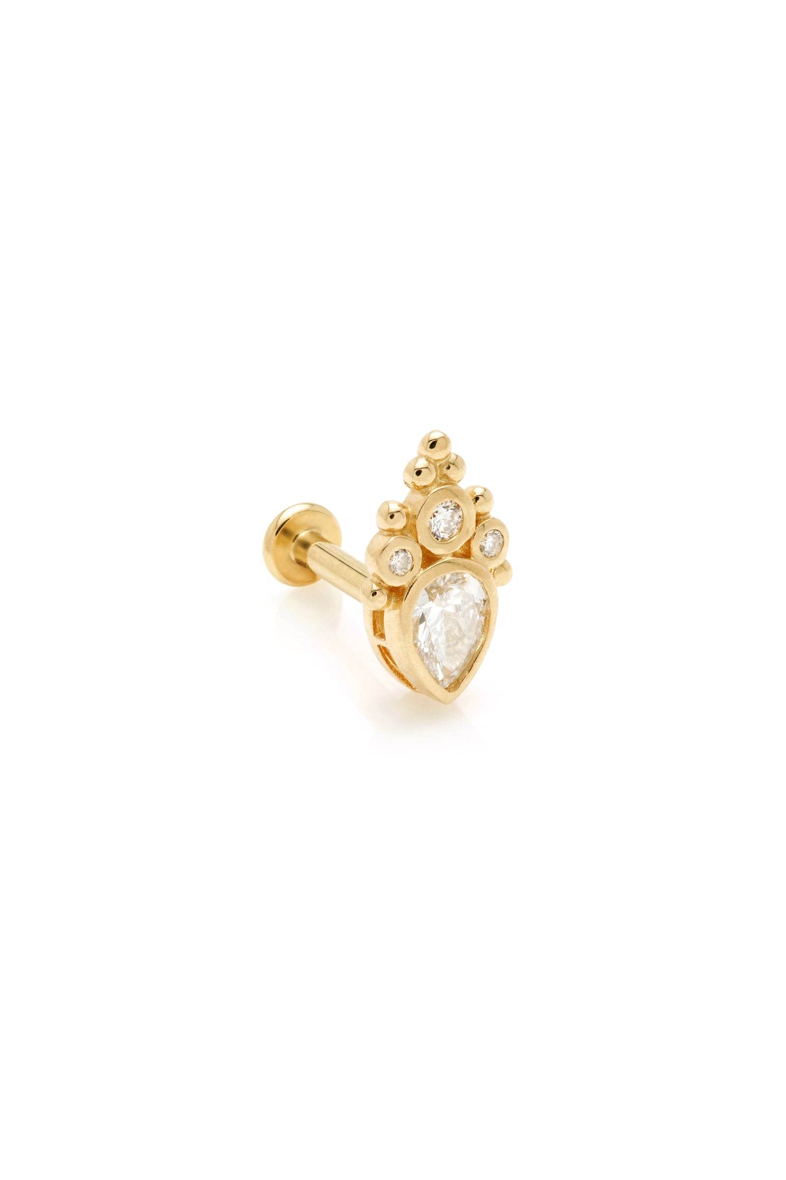 Solid 14ct Gold Threadless Teardrop Crowned Diamond Flat Back Stud Earring - Gold