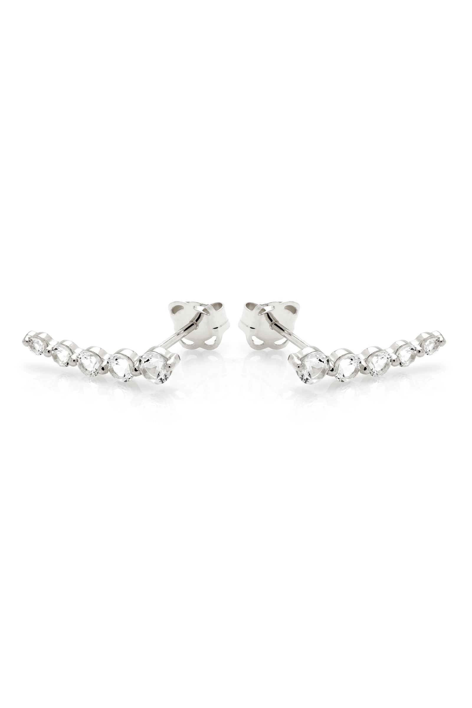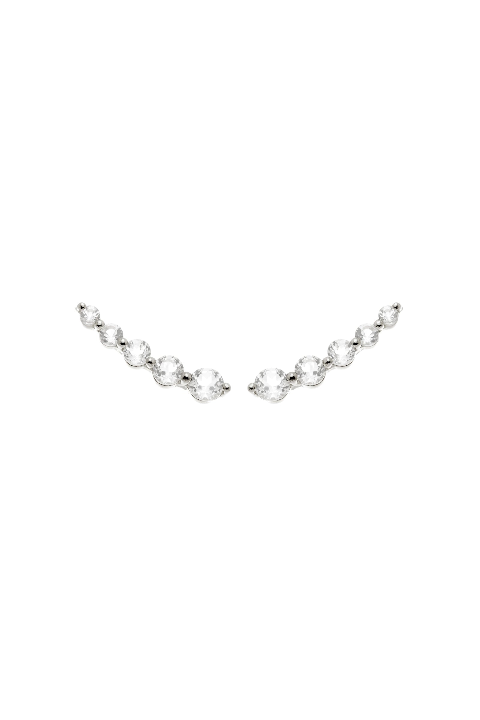An elegant take on everyday sparkle. These solid white gold climber studs curve gently up from your lobes, each set with a row of white topaz stones to catch the light and add sparkle at every angle. Versatile and eye-catching, they’re perfect for adding a little extra to your stack.