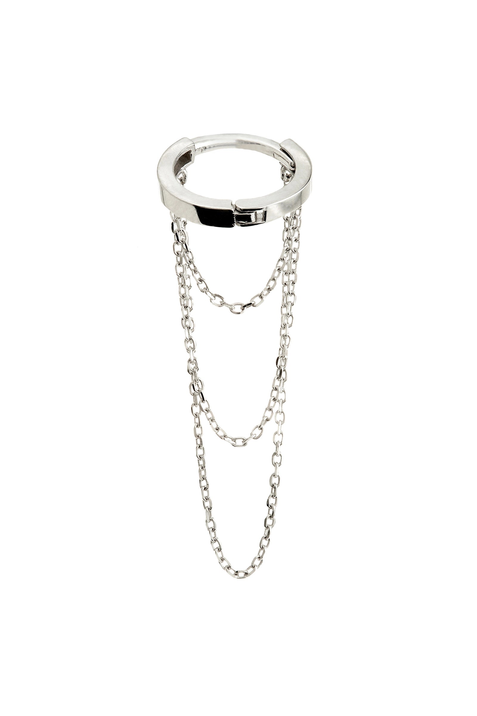 Three gold chains hang from this solid white gold earring giving a bold look with lots of movement. Designed to hang over the edge of the ear or from the lobe for soft motion and detail.
